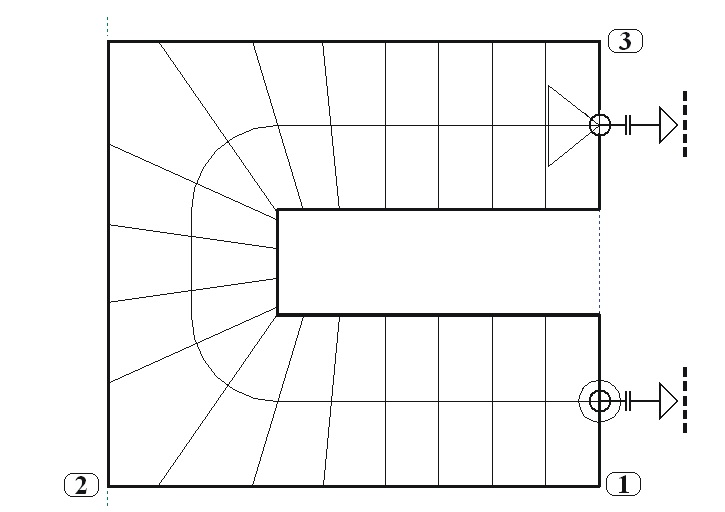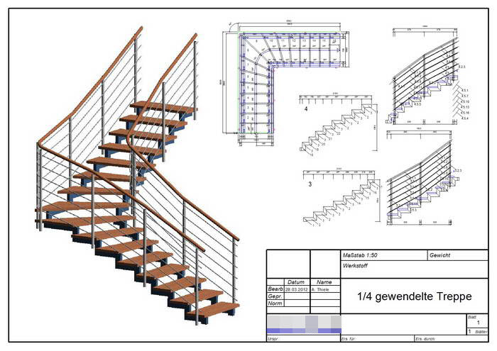 Bei 1/2 gewendelten Treppen findet die spiralförmige Drehung in der Mitte statt. |