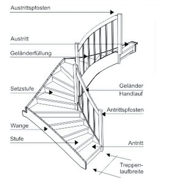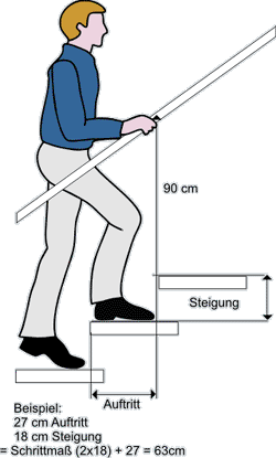 -Treppenlauf ist die ununterbrochene Folge von mindestens drei Treppenstufen (drei Steigungen) zwischen zwei Ebenen. -Lauflinie ist die gedachte Linie, die den üblichen Weg der Benutzer einer Treppe angibt. -Treppenpodest ist der Treppenabsatz am Anfang oder Ende eines Treppenlaufes, meist Teil der Geschossdecke. -Zwischenpodest (Ruhepodest) ist der Treppenabsatz zwischen zwei Treppenläufen, angeordnet zwischen den Geschossdecken. -Steigung ist das lotrechte Maß von der Trittfläche einer Stufe zur Trittfläche der folgenden Stufe. -Auftritt ist das waagerechte Maß von der Vorderkante einer Treppenstufe bis zur Vorderkante der folgenden Treppenstufe in der Laufrichtung gemessen. -Steigungsverhältnis ist das Verhältnis von Steigung zu Auftritt; dieser Quotient ist ein Maß für die Neigung einer Treppe |