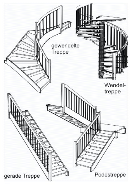 Treppen können in geradliniger oder in gewendelter Form verlaufen oder auch in Form einer Spindel aufgebaut sein. Auch gibt es Bogentreppen oder Podesttreppen. Ausschlaggebend für diese Einteilung ist die Form des Treppen-Grundrisses. Deshalb spricht man von Treppenformen. Hier werden die verschiedenen Treppenformen zur Information dargestellt. |
